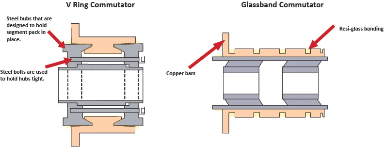 Glassband commutators were first designed by General Electric in 1960 for their redesigned line of 580 and 8000 frame machines, and later for their MD800 Armored Motors. Although performance of these commutators is good, end users and motor repair shops sometimes give them less than favorable reviews because of the difficulty in field repair of the units. With v-ring commutators, bolts can be tightened and vrings replaced, but glassbound commutators are designed to be virtually maintenance-free. In addition, the glassband comms are significantly lighter in weight than their v-ring equivalents, and under normal duty requirements, routinely out-last v-ring units by 50%.
