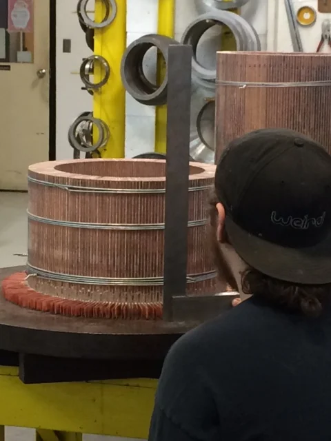 An integral part of the comm building process is checking the skew. After all the bars and mica are stood up into a segment pack we check the skew to ensure the bars are straight and not leaning to either side. It's a tedious process and takes a trained eye and patients to look at each and every bar individually. It's a step that can not be skipped because if a bar is out of skew it will cause major problems throughout the process and the comm would then need to be rebuild from the beginning.
