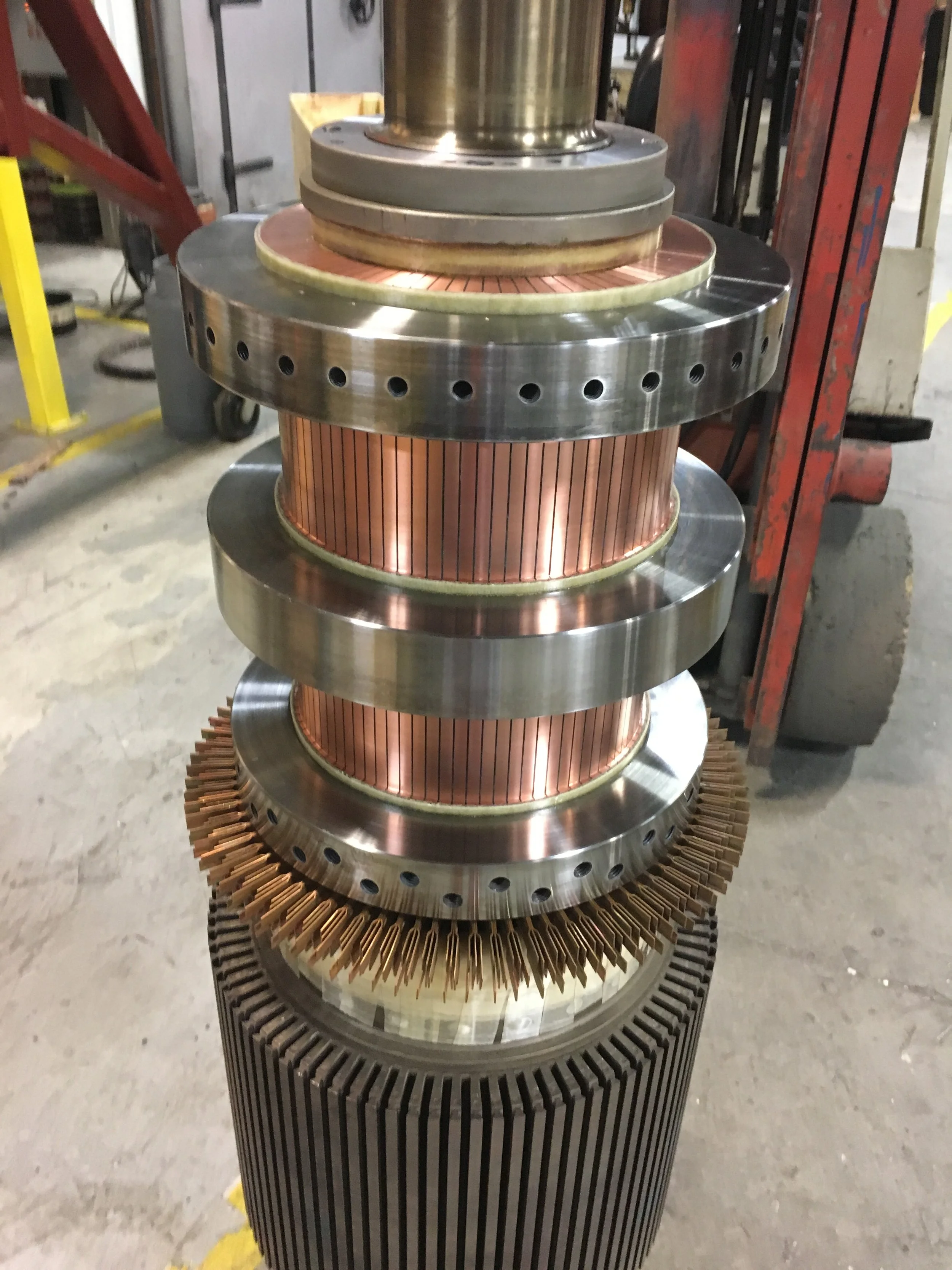 3 of 5 - Shrink Ring Progress – this compressed segment pack has been installed to the armature shaft. Designed with complex tapers on the bore of the segment pack and the OD of the shaft, the unit retains all the required fit and is ready for the next steps. Of interest, GE and Westinghouse Steel Shrink Ring designs are very different, and require a whole different set of process steps and expertise.